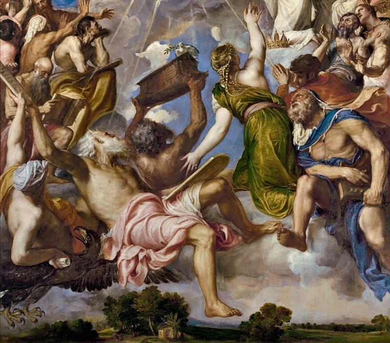 Todas estas figuras son de dimensiones gigantes y ascendentes, es decir, dan la espalda al espectador y se dirigen hacia la Trinidad. Tiziano, con este otro detalle, subraya su intención de que Cristo ha venido a dar continuidad a la historia de salvación del pueblo de Israel.
