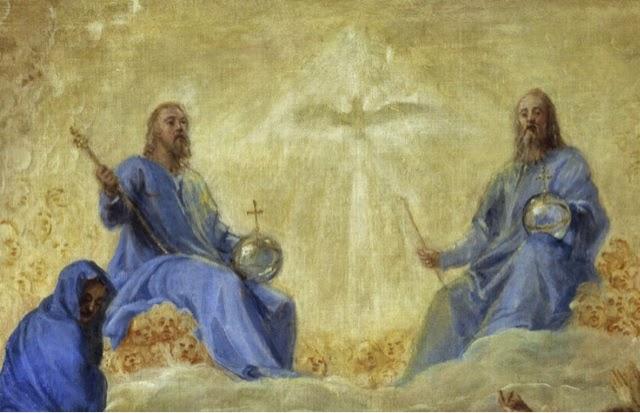 Tiziano divide la obra en tres registros ascendentes. En primer lugar, encontramos la Santísima Trinidad: Dios Padre y Dios Hijo con túnicas de color azul celeste, símbolo de la divinidad, entronizados sobre una nube, rodeados de Querubines; cada uno sosteniendo en sus manos respectivamente un orbe sobre el que se apoya la cruz y en la mano derecha el cetro. Entre ellos la paloma, símbolo por excelencia del Espíritu Santo: “Se abrió el cielo y descendió el Espíritu Santo en forma corporal, como una paloma, sobre él” (Lucas 3, 21-22).