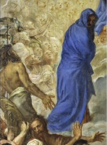 La Virgen y San Juan Bautista, no son solo los que precursores de la venida del Mesías, sino que en el juicio final son los que interceden entre Dios y la humanidad. Es precioso como Tiziano pinta a la Virgen, delante de Dios Padre, avanzando hacia ÉL, pero girada, mirando atrás al gentío. Es María que guía el pueblo de Dios, Ella es la Puerta del Cielo.