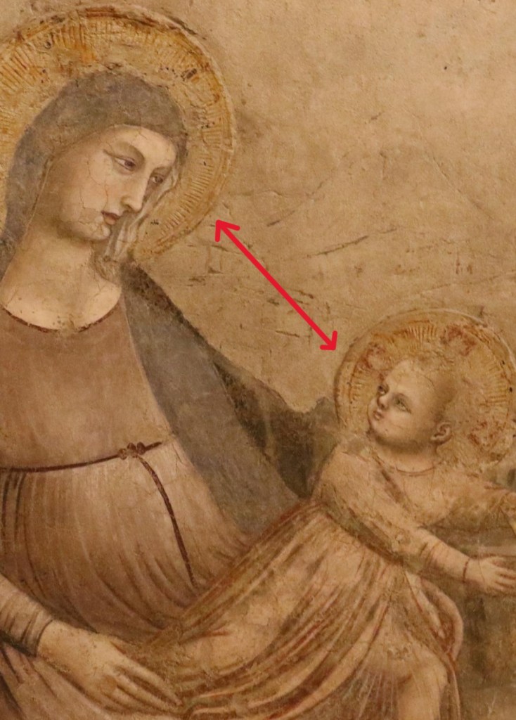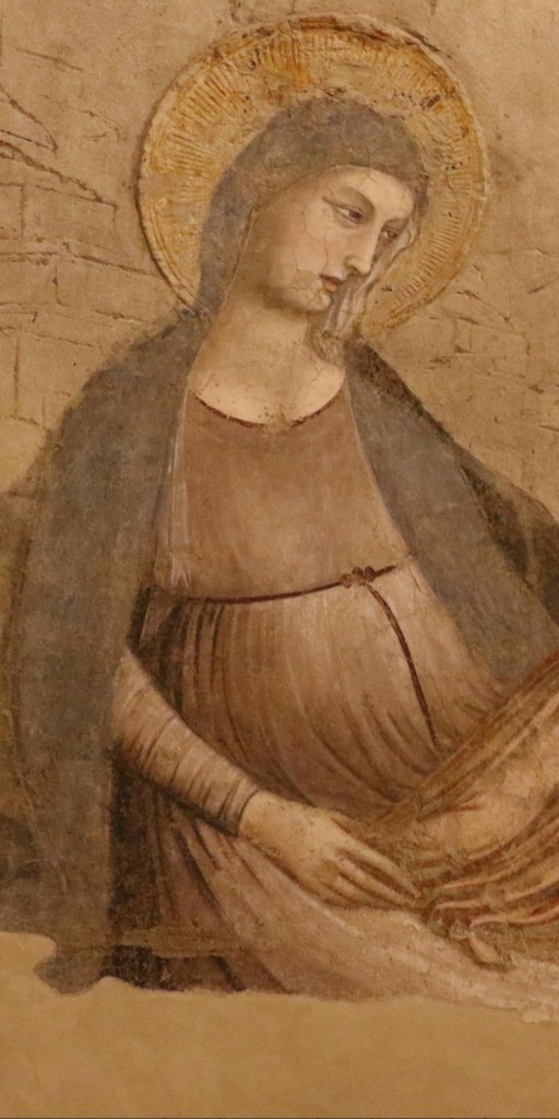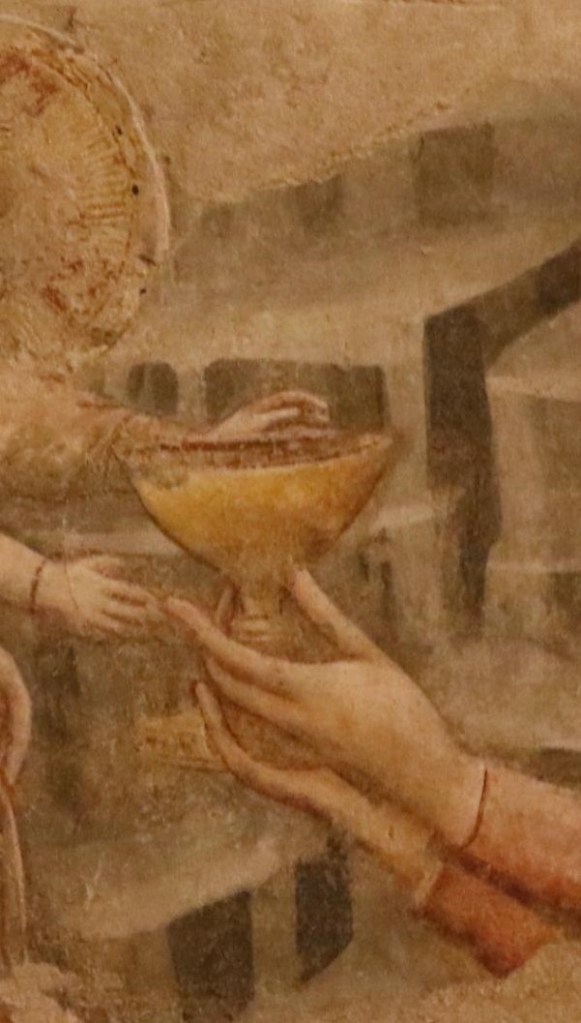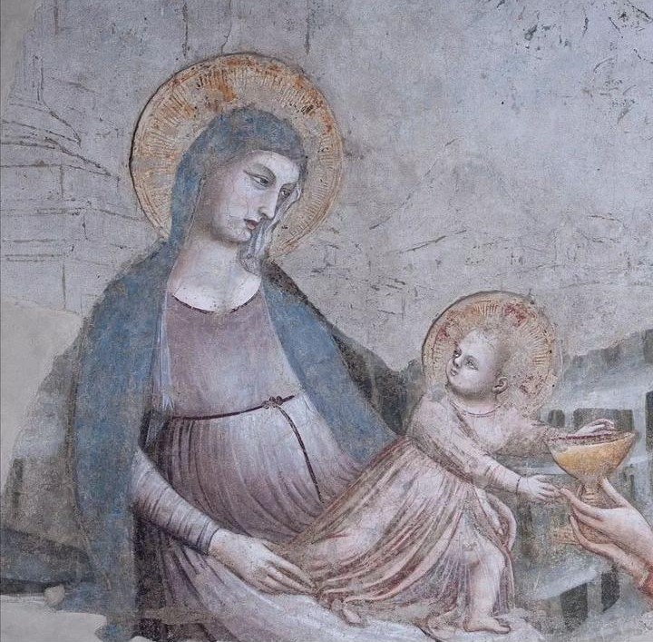 La cruz parece insignificante, como podría ser de escasa relevancia este fresco que os he propuesto, además es un fragmento…. sin embargo, conociendo la grandeza del arte y de la historia, este detalle del cáliz de vino que el niño Jesús acepta beber, encierra toda la potencia del universo. Encarnación, pasión, muerte y Resurrección que sin estos «síes» que bien María y bien Jesús no hubieran dicho, nuestra vida seguiría en las tinieblas y por lo tanto nuestra fe sería inútil, vana.
